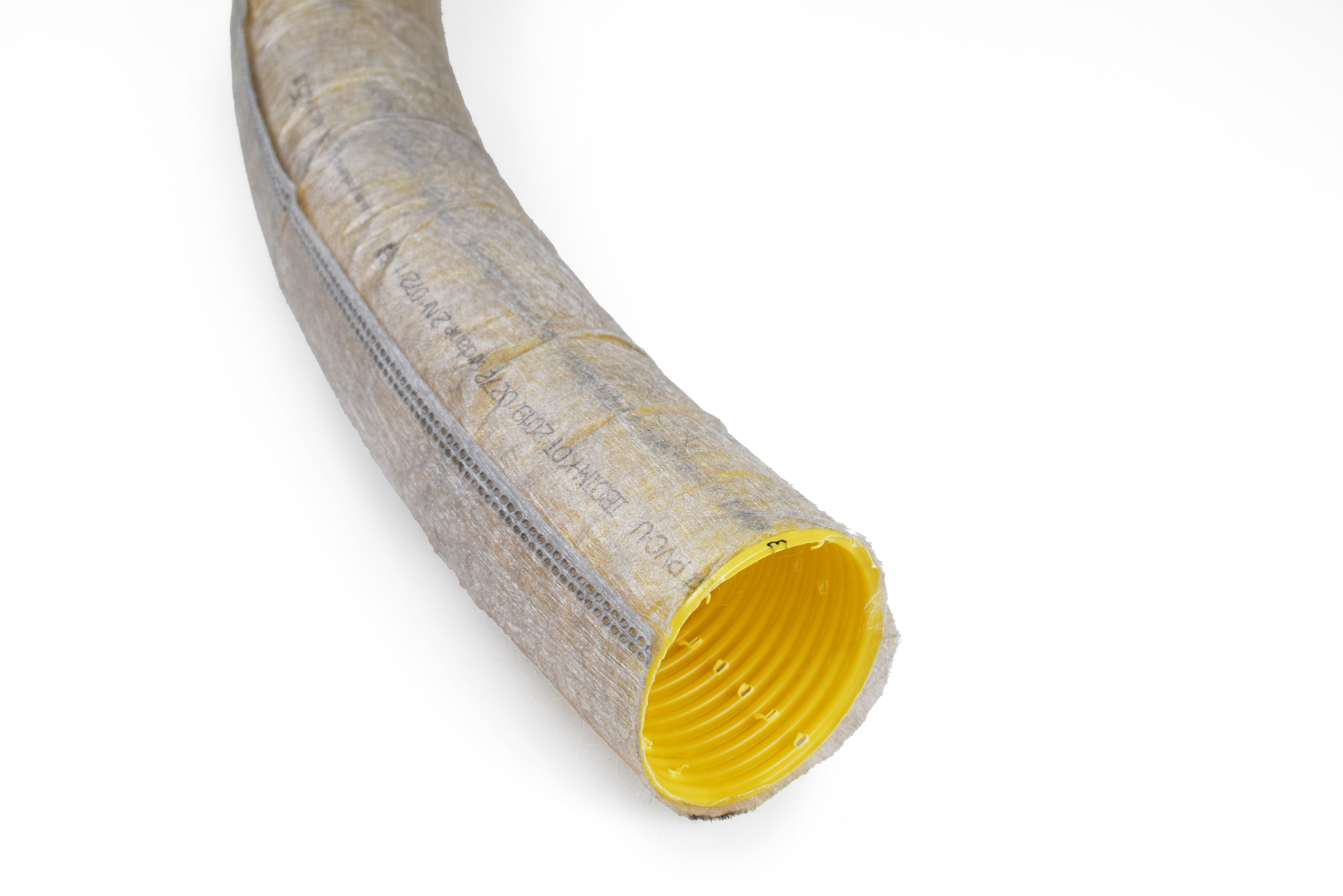 Труба для дренажу діаметром 100 мм, обгорнута геотекстилем, для ефективного фільтрування.