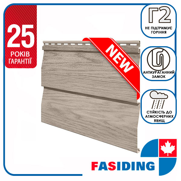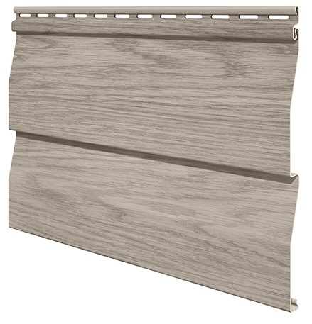 Панель сайдингу з полівінілхлориду у вигляді корабельного брусу з текстурою під дерево. Такий будівельний матеріал застосовують для реконструкції та облицювання фасадів. Гарантія в 25 років розповсюджується на вигоряння і механічну стійкість сайдингу та підтверджує якість і довговічність товару. Стінову панель виготовляють методом співплавлення двох різних мас пластику, від чого у вінілового сайдингу є дві поверхні – зовнішня та внутрішня. Зовнішня поверхня сайдингу відповідає за взаємодію з навколишнім середовищем, її склад протистоїть вигорянню, викривленню панелей, здуттю та лущенню поверхні. Внутрішня відповідає за жорсткість конструкції; від якості тієї поверхні залежить, як буде поводитися сайдинг під час зміни температур та при механічному впливі. Зображення наноситься на панель за допомогою унікальної технології термодруку, яка дозволяє ідеально передати текстуру і колір справжньої деревини. Антиураганний замок запобігає пошкодженню панелі під час екстремальних погодних умов. Панель має рівень горючості Г2 (не підтримує горіння) завдяки чому є безпечною для використання на фасаді будинку. Простота установки дозволяє провести монтаж на фасад без залучення спеціалістів з будівництва.