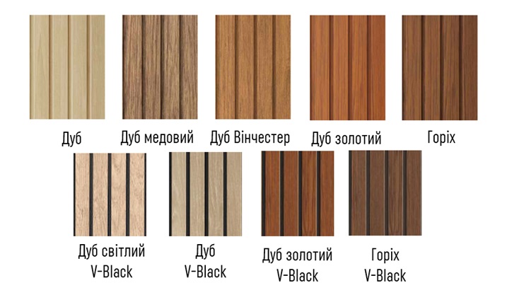 Колекція представлена у 9 актуальних кольорах під дерево — від світлих відтінків до глибоких насичених тонів. Це дозволяє підібрати матеріал для будь-яких дизайнерських рішень.